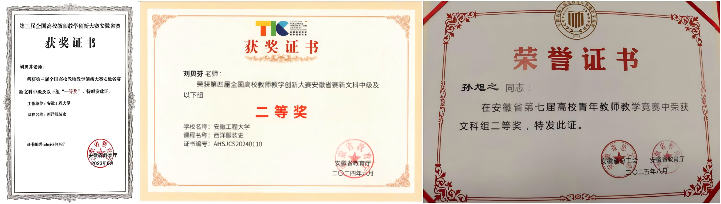 教师教学水平持续提升。近三年,获第三届全国高校教师教学创新大赛安徽省赛一等奖1项,第四届全国高校教师教学创新大赛安徽省赛二等奖1项,安徽省高校青年教师教学竞赛二等奖1项;获未来设计师全国艺术设计教师教学创新大赛国赛二等奖1项、三等奖1项,省赛二等奖1项;获“匠心筑梦 领航未来”全国高校教师技能创新大赛一等奖1项、三等奖4项。